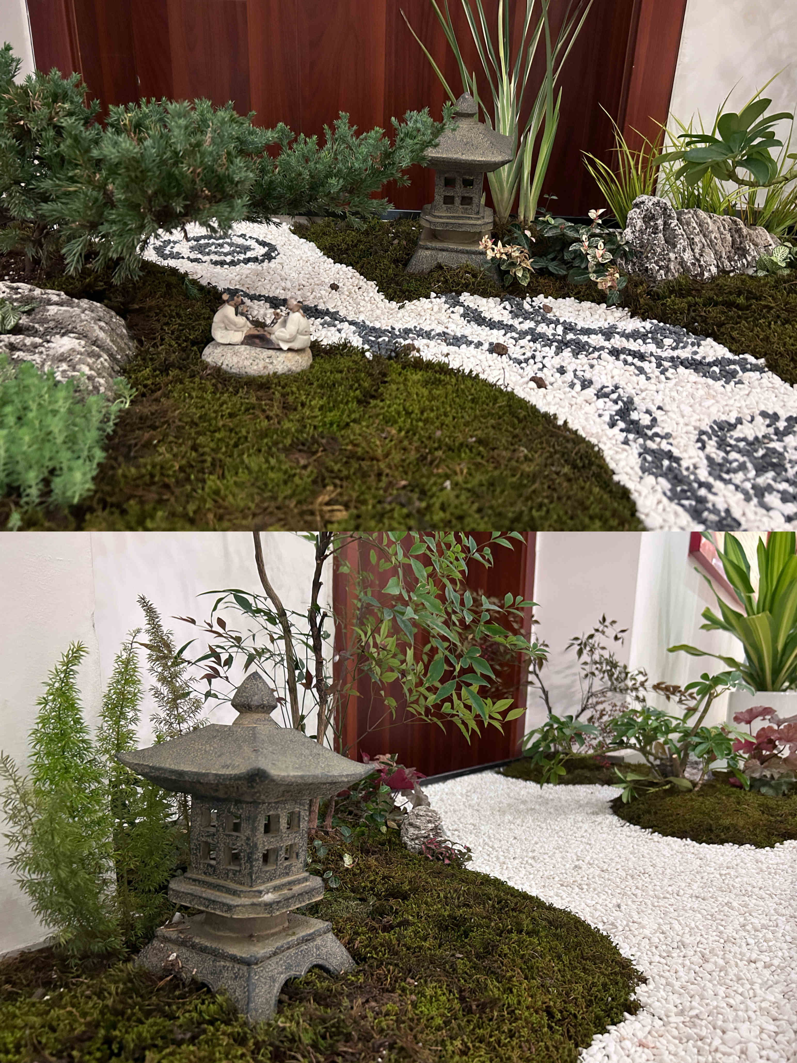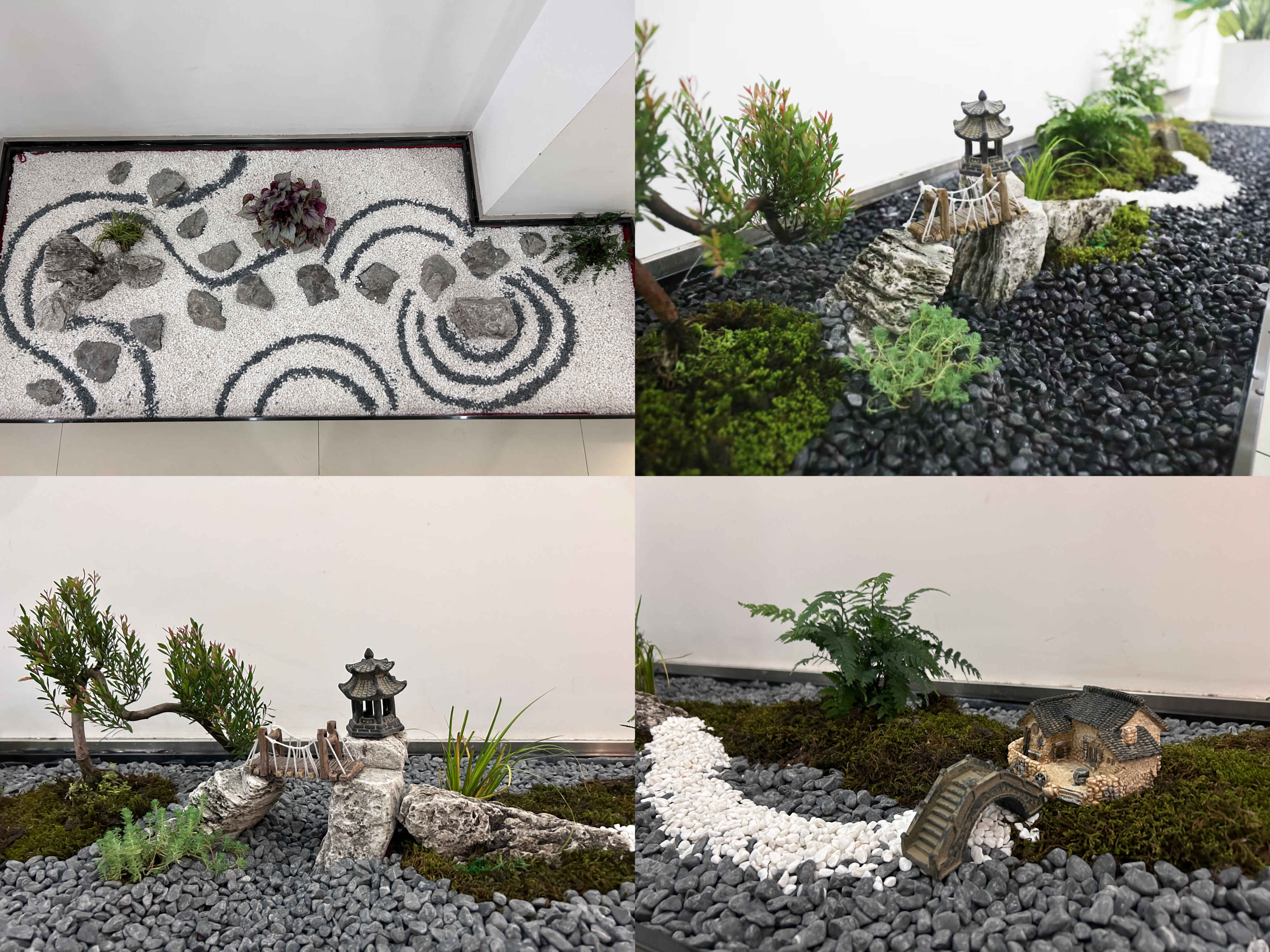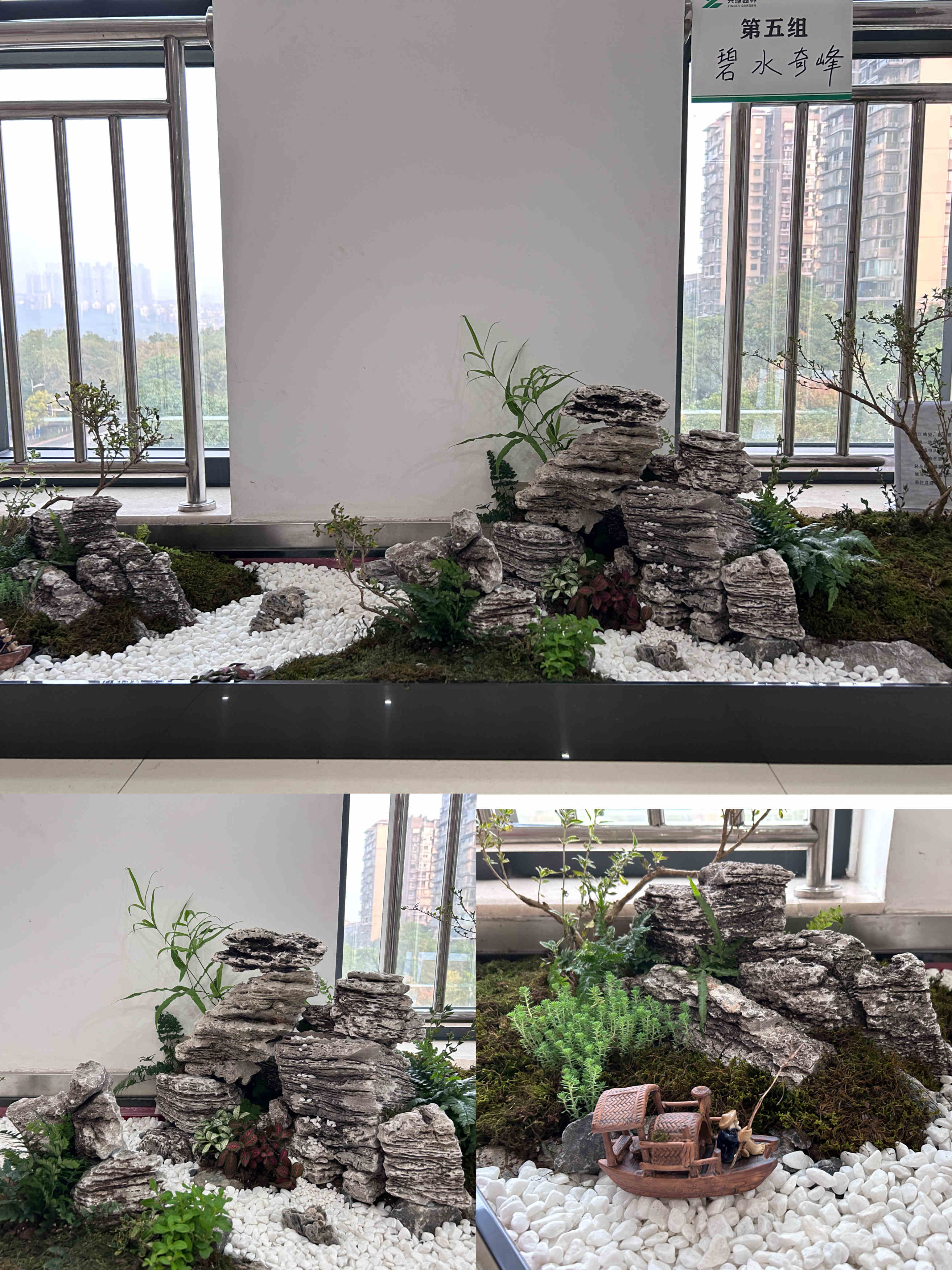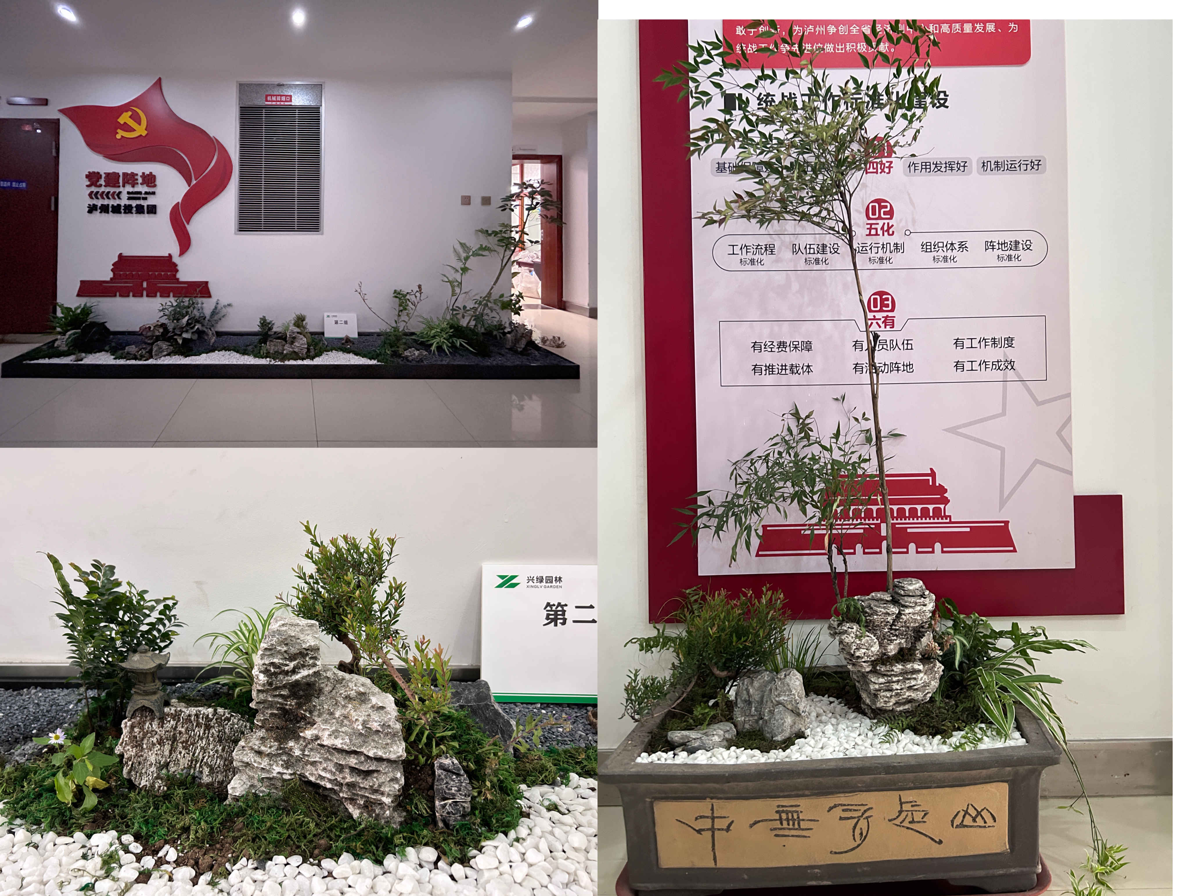 本次大賽共分5個(gè)組參賽,全體職工通過抽簽進(jìn)行分組和選取場地。大賽第一階段,各小組積極討論方案設(shè)計(jì)、選擇造景材料;大賽第二階段,各小組充分發(fā)揮自己的動(dòng)手能力,從基層處理、放線布局、掇山理石、堆坡造型到植物栽植、修剪成型,工完場清,每個(gè)過程都專注而有條理。選手們各顯身手、較好地利用了山石紋理和形態(tài)、植物的形色進(jìn)行創(chuàng)作,完成的作品主題突出、構(gòu)圖優(yōu)美、意境深遠(yuǎn),用“以小見大”的山水園林意境展現(xiàn)興綠園林人對(duì)開拓公司美好征程的雄心壯志。