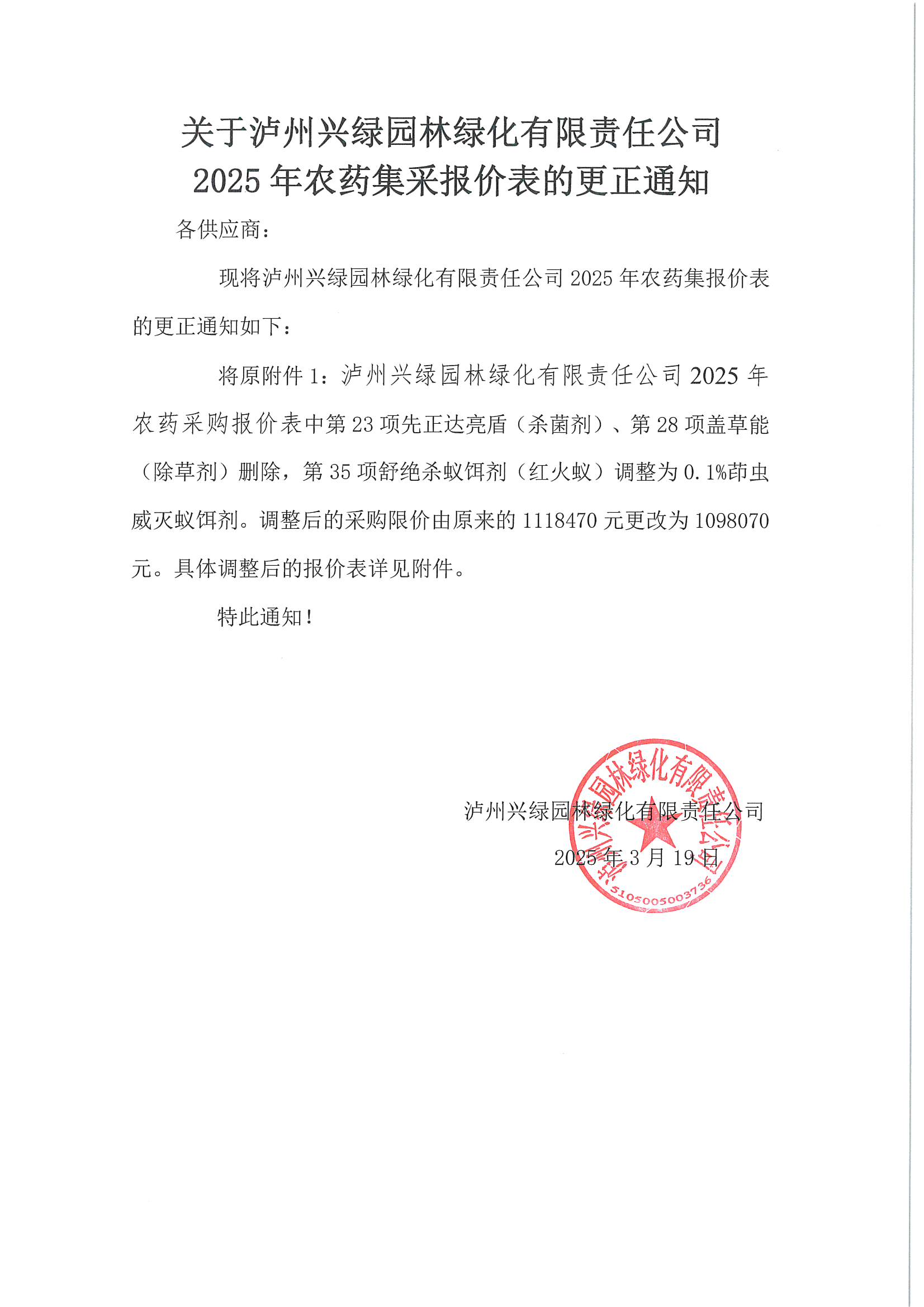 關(guān)于瀘州興綠園林綠化有限責(zé)任公司2025年農(nóng)藥集采報(bào)價(jià)表的更正通知