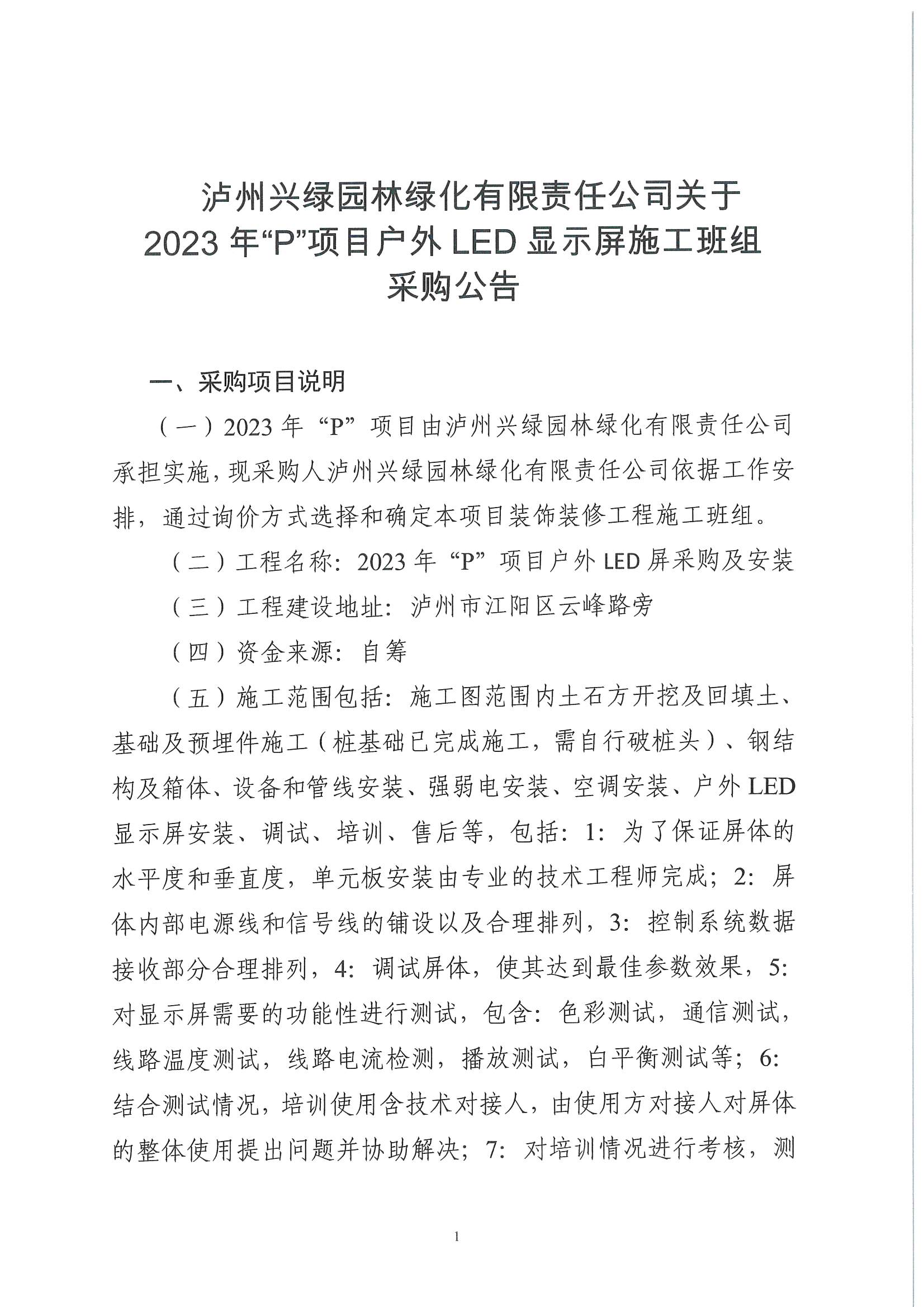 瀘州興綠園林綠化有限責(zé)任公司關(guān)于2023年“P”項(xiàng)目戶外LED顯示屏施工班組 采購(gòu)公告