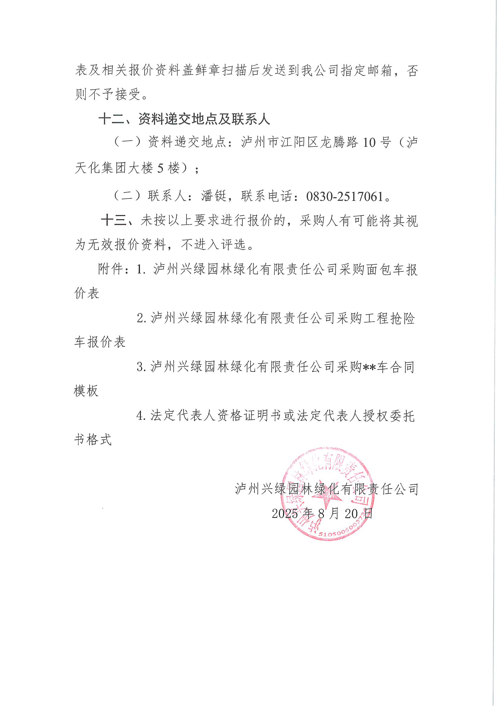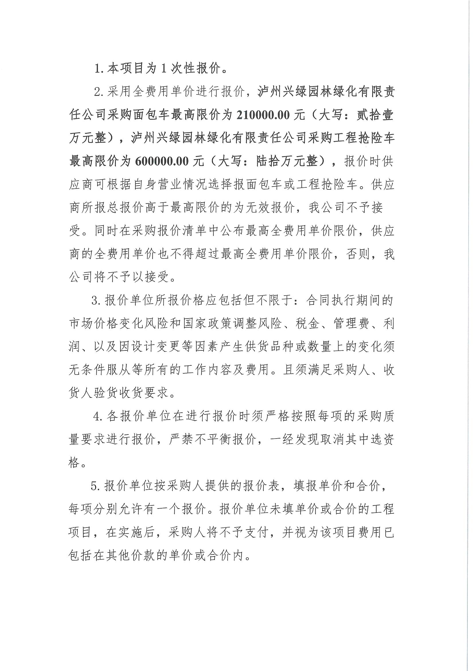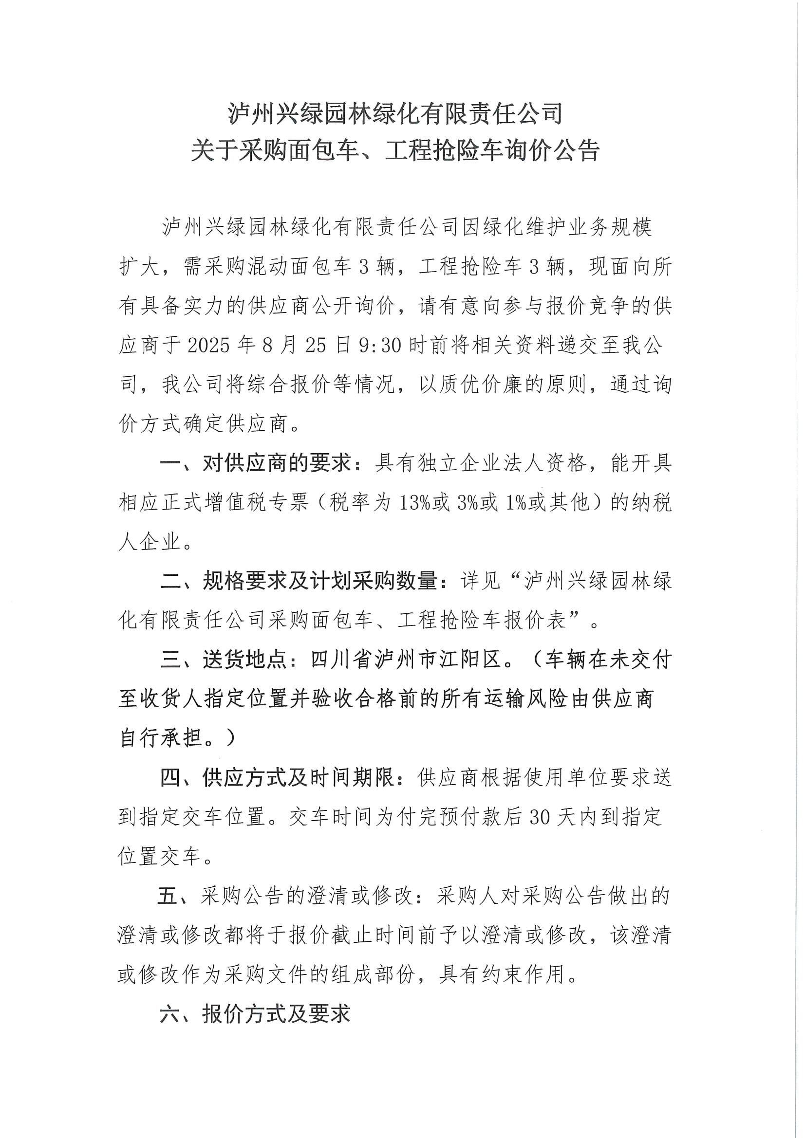 瀘州興綠園林綠化有限責(zé)任公司關(guān)于采購面包車、工程搶險(xiǎn)車詢價(jià)公告