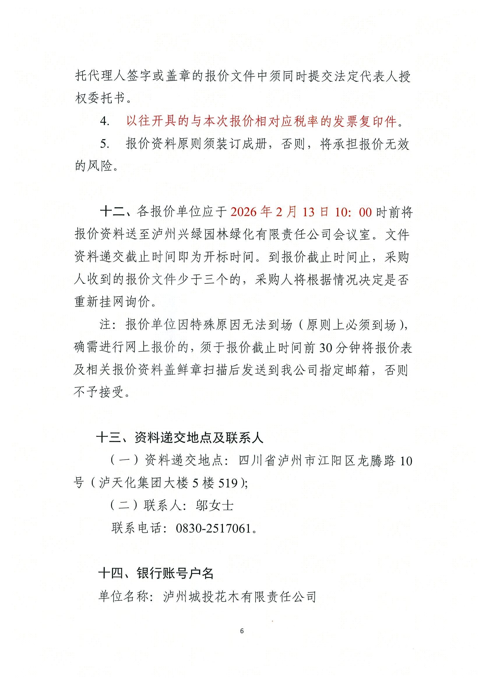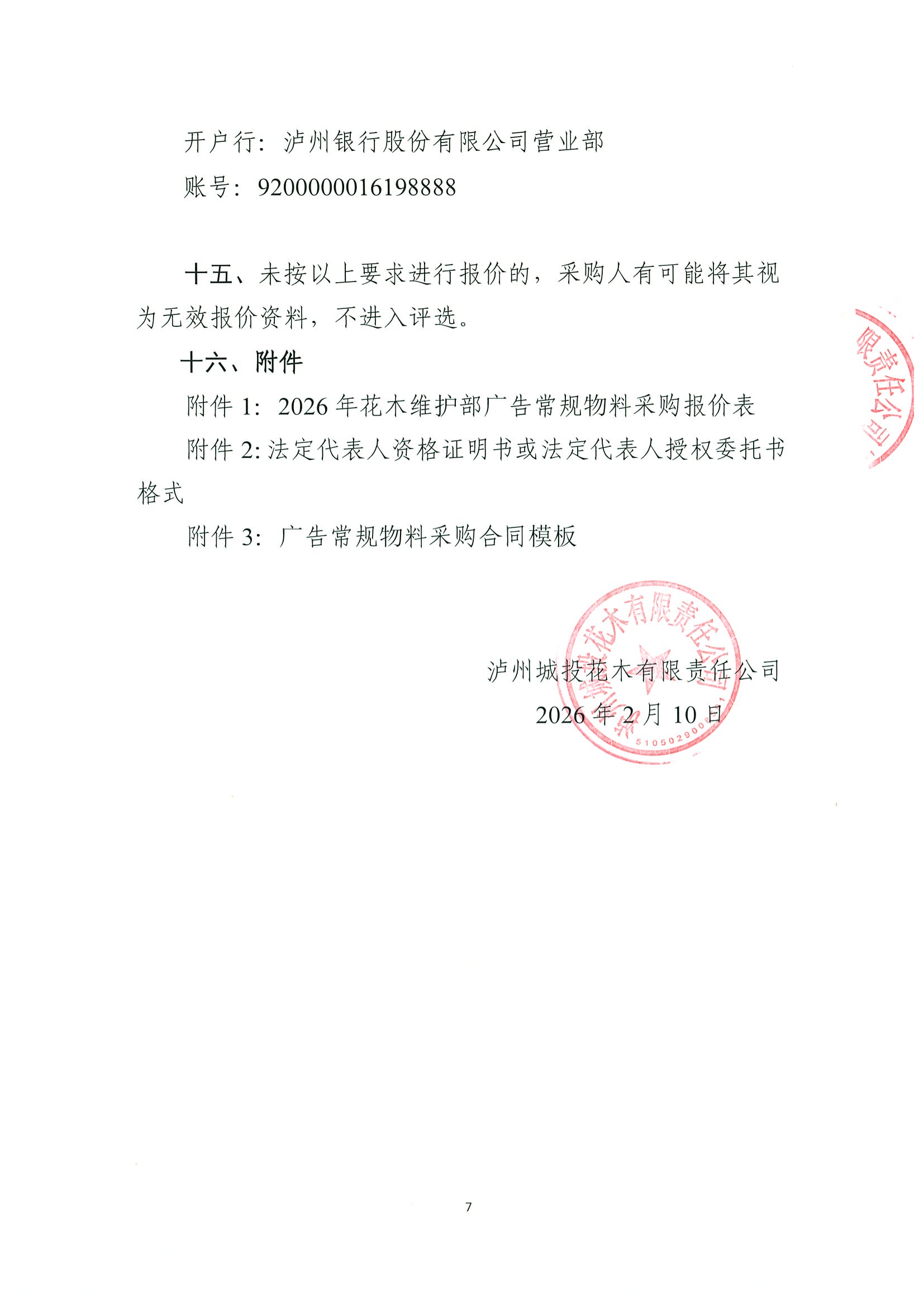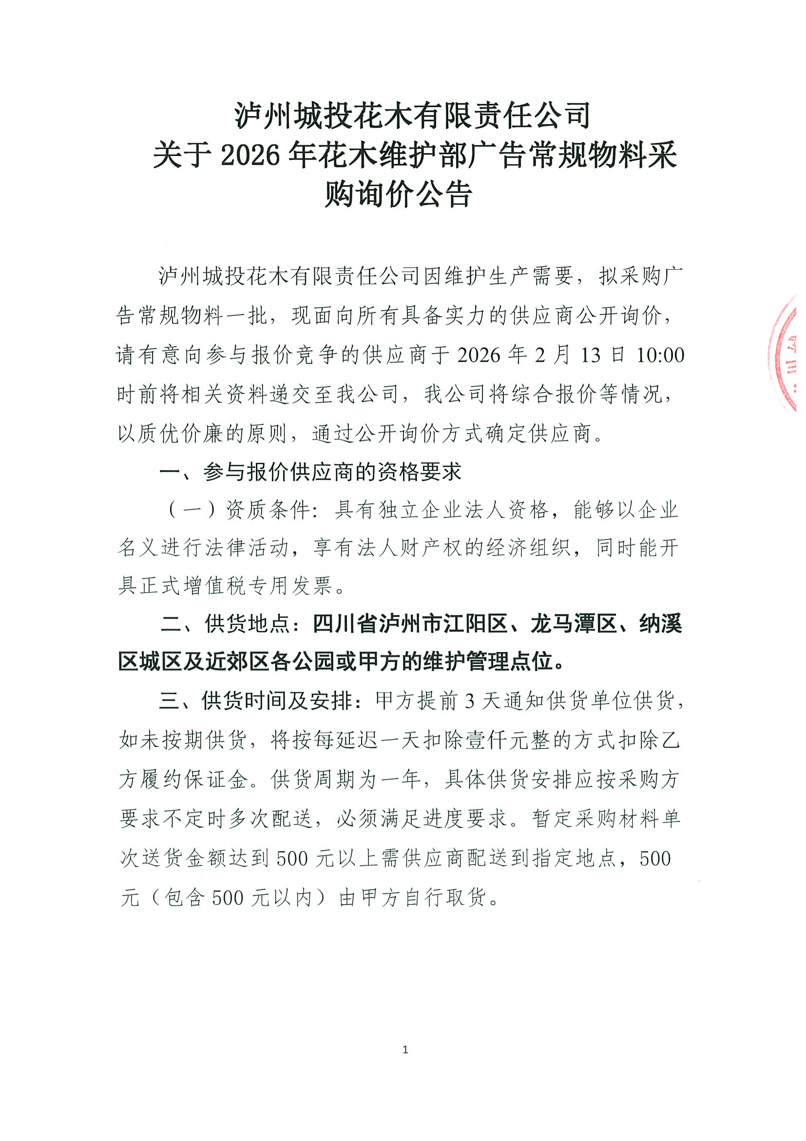 瀘州城投花木有限責(zé)任公司關(guān)于2026年花木維護(hù)部廣告常規(guī)物料采購詢價公告